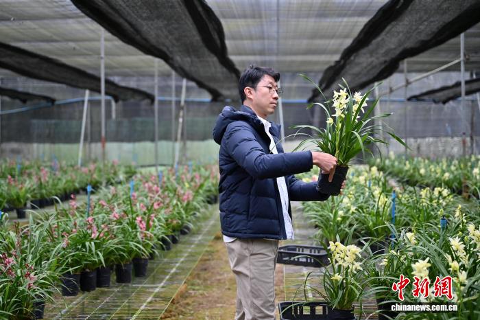 1月22日,蘇英禎(右)和賴昀辰(左)在位于廣州市的蘭花基地查看國蘭長勢。來自臺灣的蘇英禎和賴昀辰接力父輩賴文彬的蘭花事業(yè),扎根廣州打造“蘭花王國”?!芭_農(nóng)二代”賴昀辰繼承父親賴文彬的衣缽,通過探索和展銷多元品種的蘭花,結(jié)合直播等方式向年輕人展現(xiàn)蘭花的優(yōu)雅與韻味,推廣蘭花文化。蘇英禎不僅延續(xù)其岳父賴文彬畢生耕耘的蘭花事業(yè),更將目光投向推動(dòng)兩岸蘭花產(chǎn)業(yè)經(jīng)驗(yàn)交流,致力于讓更多人了解中國蘭花所蘊(yùn)含的傳統(tǒng)文化內(nèi)涵。中新社記者 陳楚紅 攝