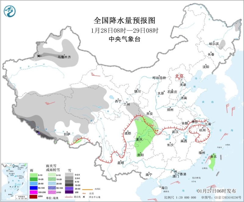 1月28日08時至29日08時,新疆北疆北部和沿天山一帶地區(qū)、西藏大部、青海大部、甘肅南部等地部分地區(qū)有小到中雪,其中,西藏西南部等地部分地區(qū)有大到暴雪,局地大暴雪(20~25毫米)。陜西南部、湖北南部和西部、四川盆地東部、重慶大部、貴州中北部、臺灣島大部等地部分地區(qū)有小雨。西藏北部、甘肅河西等地部分地區(qū)有4~5級風。臺灣海峽、臺灣以東洋面、巴士海峽、南海東北部海域將有6~7級風、陣風8級,黃海中部和南部海域、東海大部海域、南海大部海域將有4~6級風、陣風7級。