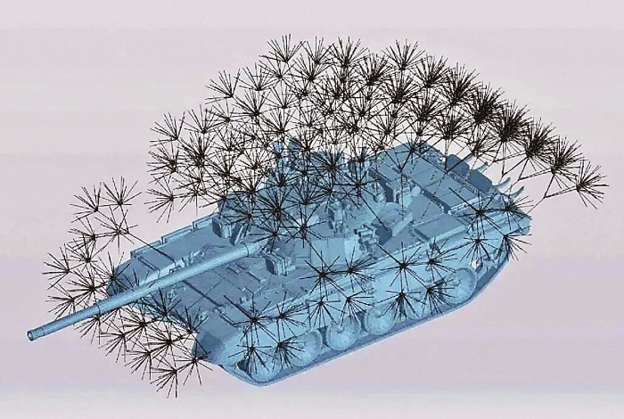 在該系統(tǒng)中,“蒲公英”的枝干由玻璃纖維復(fù)合材料制成,既保證了一定強(qiáng)度,也減輕了重量。單套“蒲公英”的重量?jī)H有金屬格柵的1/3~1/4,有助于裝甲車(chē)輛機(jī)動(dòng)。因?yàn)椴馁|(zhì)是玻璃纖維,帶有一定韌性,加上其獨(dú)特的多層分支和向上開(kāi)叉布局,“蒲公英”不僅能在相對(duì)狹窄的環(huán)境中發(fā)生變形并通過(guò),而且在一些林區(qū)行進(jìn)時(shí),不易被樹(shù)枝等鉤掛、阻擋。