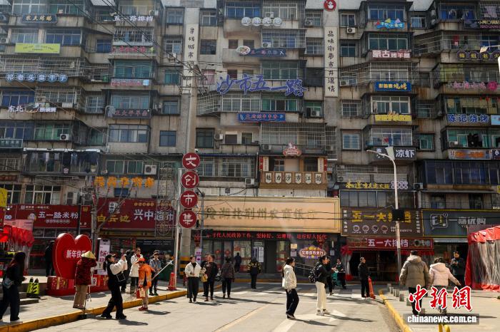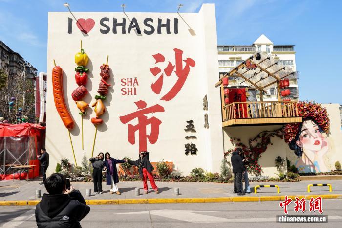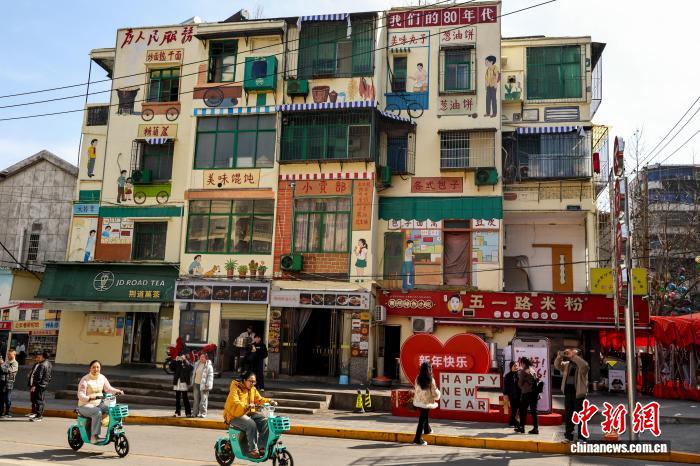 2月20日,春節(jié)假期,民眾在荊州市沙市區(qū)的五一路打卡游玩。這條百年老街雖不長,卻滿載著荊州的市井溫情,來這里,品的不只是美食,更是一份濃濃的鄉(xiāng)愁與煙火氣。圖為游客觀看老街上的80年代主題墻繪。中新社記者 張暢 攝