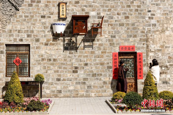 圖為游客老街上的一處景觀造景前拍照打卡。中新社記者 張暢 攝