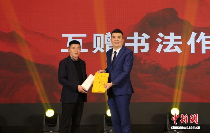 3月1日,臺(tái)灣鄉(xiāng)親(右)將書法作品“鄰里公望·緣聚富春”贈(zèng)予大陸同胞。中新社記者 郭其鈺 攝