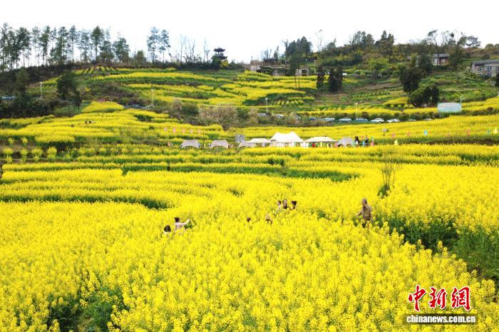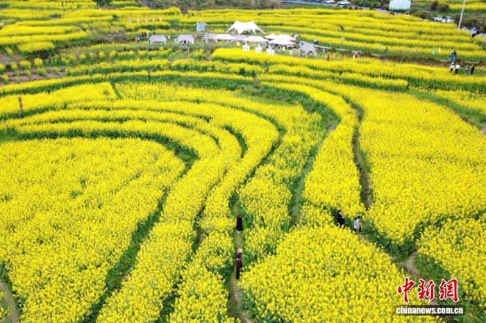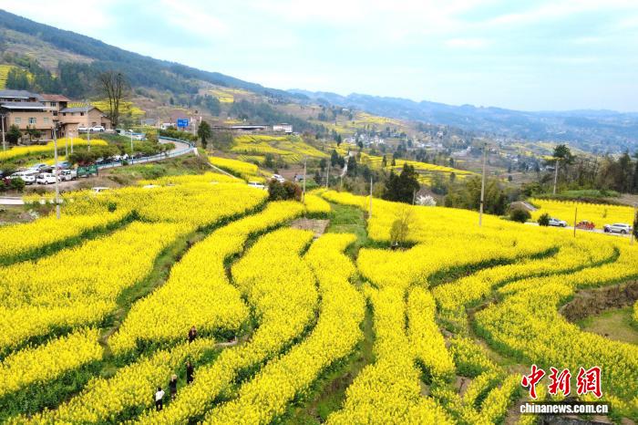 3月6日,“文蔚廟埡·夢里老家”重慶武隆廟埡油菜花節(jié)啟幕。萬畝梯田油菜花盛開,山坡被“染”成金黃。層層疊疊的油菜花隨著山勢連綿起伏,吸引眾多游客前來賞花拍照。圖為重慶武隆廟埡梯田油菜花盛開。(無人機(jī)照片)中新社記者 肖江川 攝