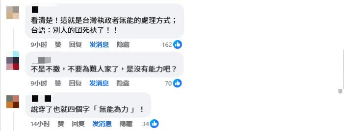 相較于大陸的積極作為,臺當(dāng)局不僅抹黑大陸協(xié)助臺胞撤離的行為,還堅拒撤僑,稱“僑胞認(rèn)為留在當(dāng)?shù)匕踩?,如此表態(tài)讓臺灣社會的批評聲浪不斷發(fā)酵。臺灣網(wǎng)友表示,“不是不撤,是沒能力撤!”、“以后出境還是帶上臺胞證才安心!”