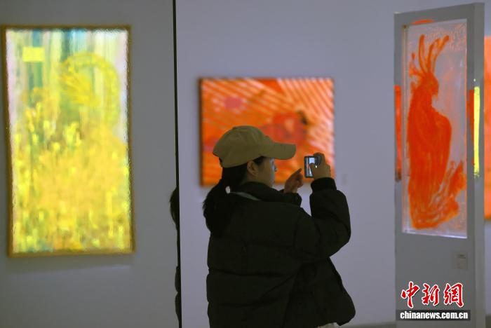 圖為在3月13日預(yù)展中,參觀者拍攝展出的作品。中新社記者 王磊 攝