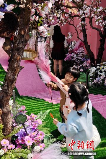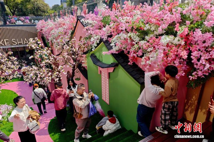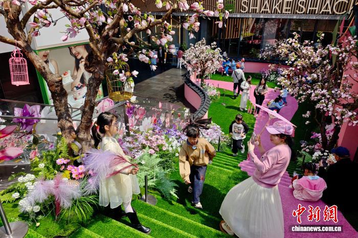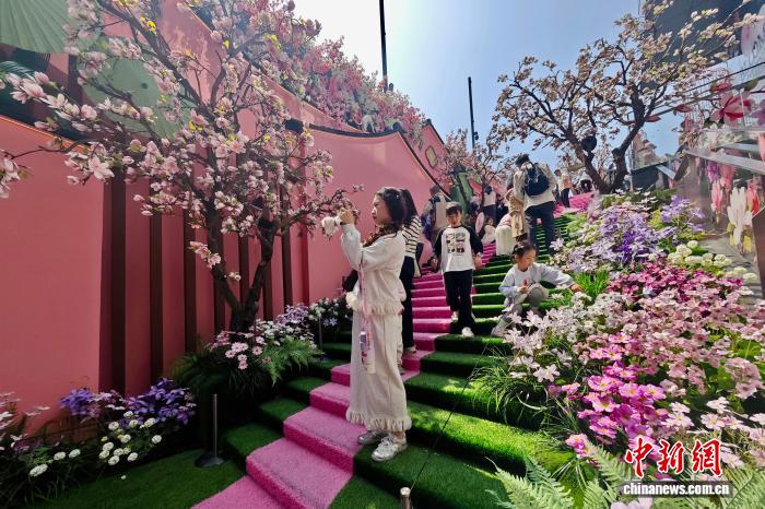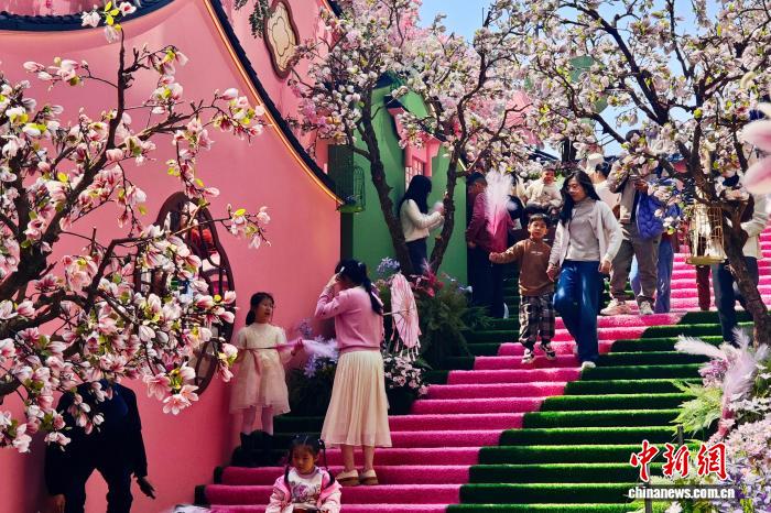 3月22日,福建福州,市民在一處用假花裝扮的人工造景景點游玩。近日,福州西禪寺附近“粉黛望春”人工造景繪就滿園春色,吸引許多市民和游客前來游玩。中新社記者 王東明 攝