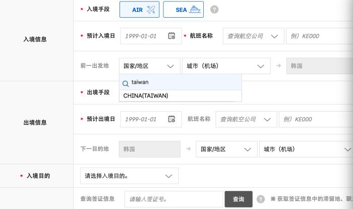 圖為韓國電子入境申報單截圖。