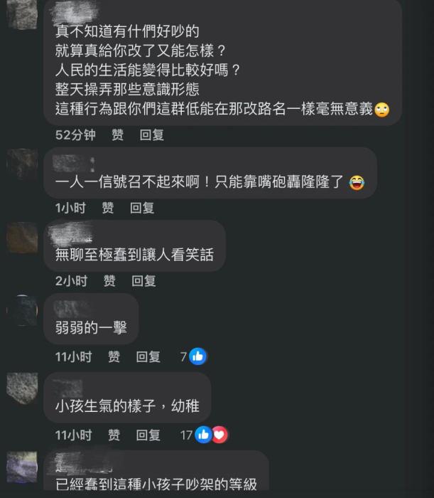 不少臺灣網(wǎng)友也對此事進(jìn)行嘲諷,有人表示“真不知道有什么好吵的,就算真給你改了又能怎樣?人民的生活能變得比較好嗎?”,還有人嘲諷“無聊至極蠢到讓人看笑話”“小孩子生氣的樣子,幼稚”。