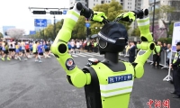3月29日,AI交通管理機(jī)器人向馬拉松跑者作出“比心”動作。當(dāng)日,2026杭州夢想小鎮(zhèn)半程馬拉松在浙江杭州余杭未來科技城開跑,當(dāng)?shù)毓惨階I交通管理機(jī)器人、AR眼鏡等設(shè)備,以科技力量護(hù)航城市馬拉松。中新社記者 王剛 攝