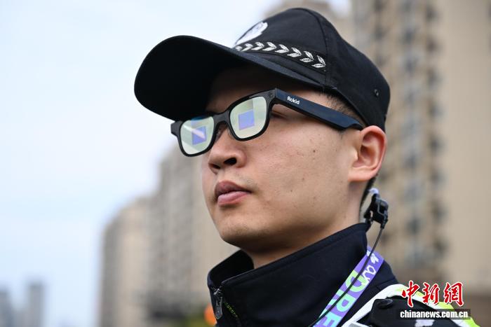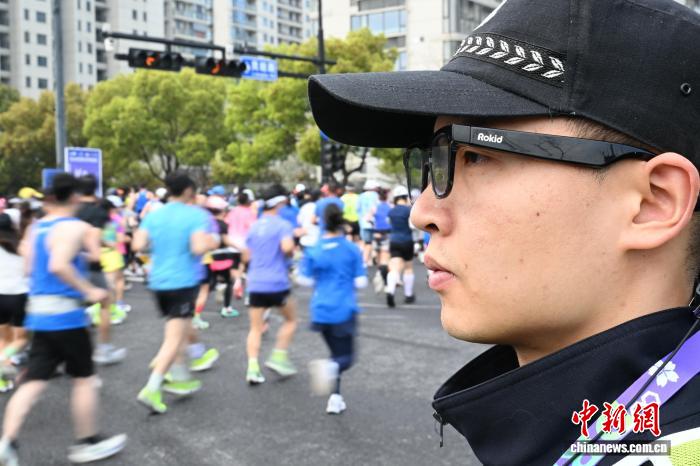 3月29日,馬拉松現(xiàn)場的民警佩戴AR智能眼鏡。當(dāng)日,2026杭州夢想小鎮(zhèn)半程馬拉松在浙江杭州余杭未來科技城開跑,當(dāng)?shù)毓惨階I交通管理機(jī)器人、AR眼鏡等設(shè)備,以科技力量護(hù)航城市馬拉松。中新社記者 王剛 攝