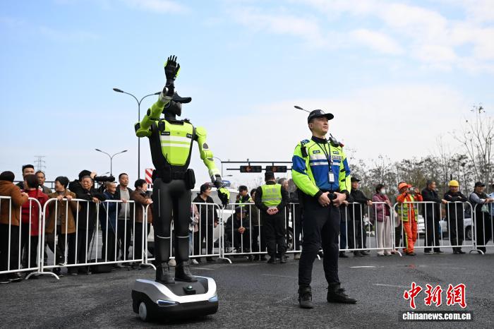 3月29日,AI交通管理機(jī)器人在交警旁邊引導(dǎo)馬拉松跑者。當(dāng)日,2026杭州夢想小鎮(zhèn)半程馬拉松在浙江杭州余杭未來科技城開跑,當(dāng)?shù)毓惨階I交通管理機(jī)器人、AR眼鏡等設(shè)備,以科技力量護(hù)航城市馬拉松。中新社記者 王剛 攝