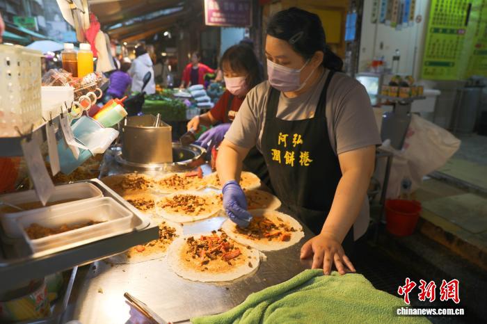清晨6時(shí),天光微亮,臺(tái)北吳興街市場(chǎng)已經(jīng)熱鬧起來(lái)?!鞍⒑霛?rùn)餅卷”店的老板陳和錦,正利落地?cái)偝鲆粡垙埍★炂?,空氣中彌漫著面皮炙烤的焦香。這家“游牧式”經(jīng)營(yíng)二十多年的老攤,是許多臺(tái)北人清明記憶的一部分。