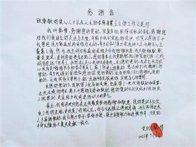 被資助學(xué)生寫給張景杰的感謝信。受訪者供圖