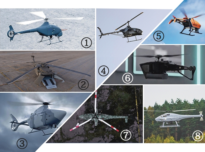 圖①:VSR700無人機;圖②:S-70 UAS“黑鷹”無人直升機;圖③:Proteus無人直升機(渲染圖);圖④:Alpin無人直升機;圖⑤:HT-100無人直升機;圖⑥:Nanoalp微型無人機;圖⑦:“獵人”偵察和攻擊無人直升機;圖⑧:Skeldar V-200無人直升機。